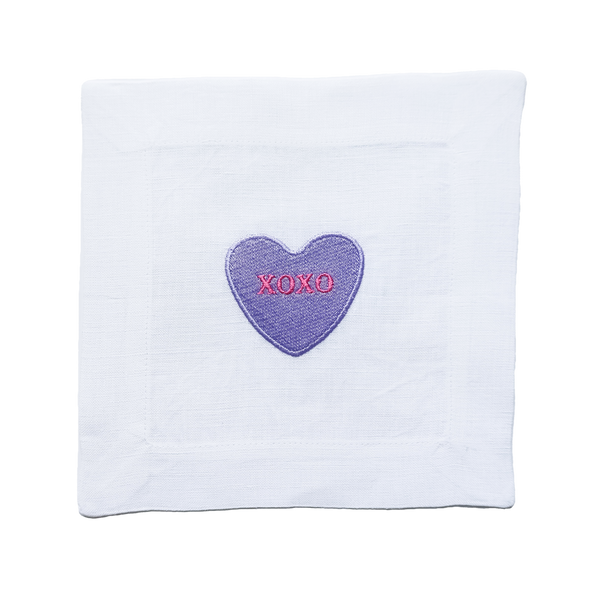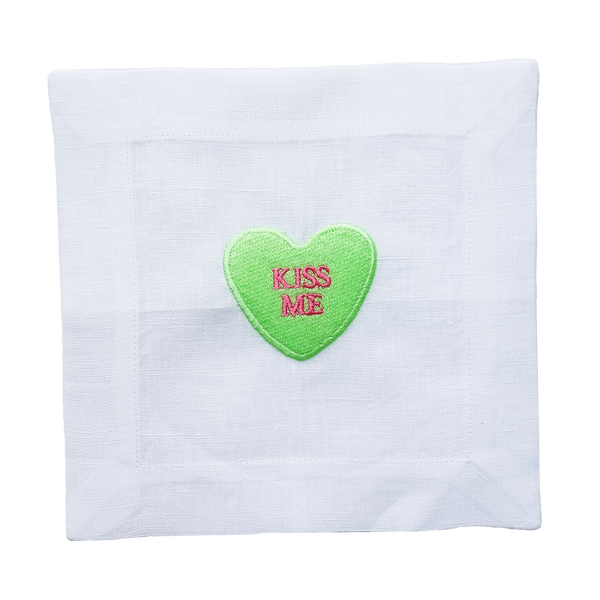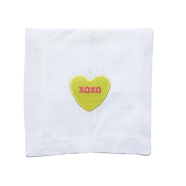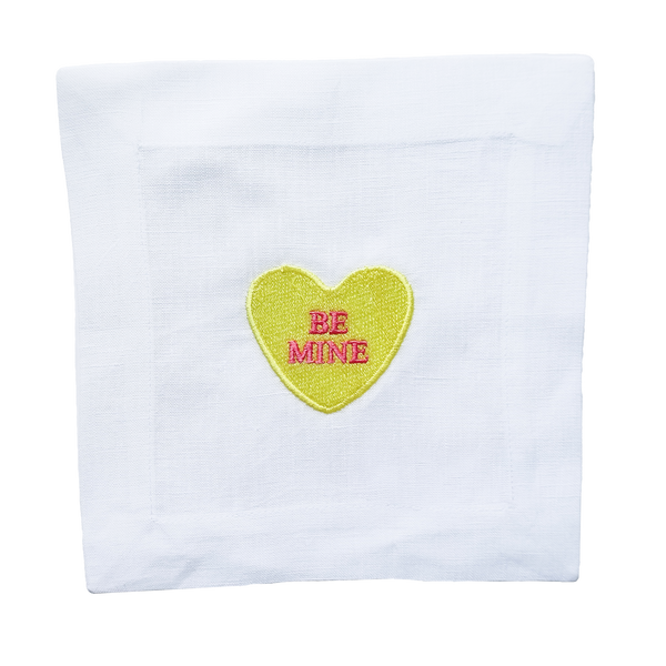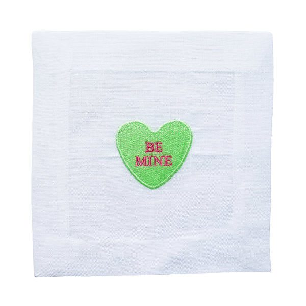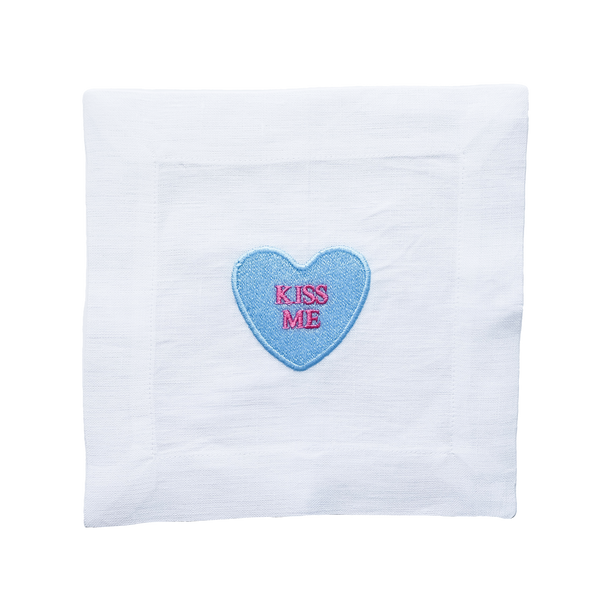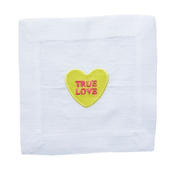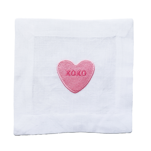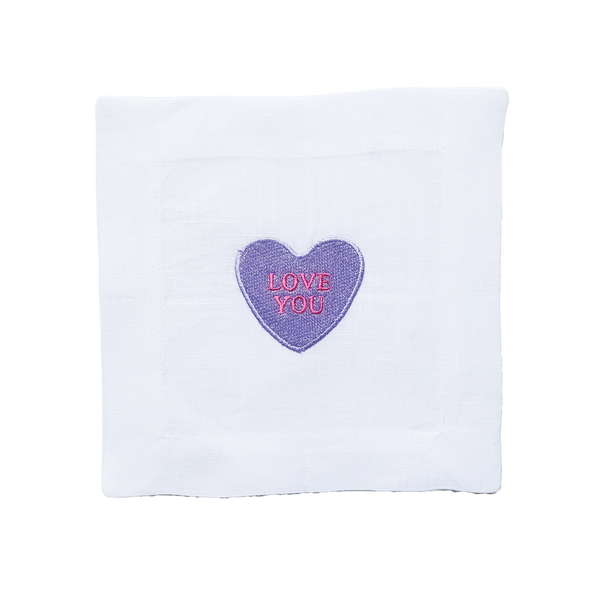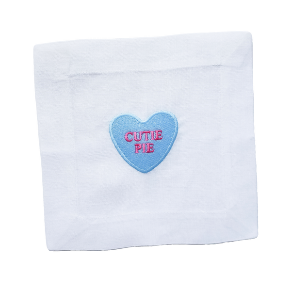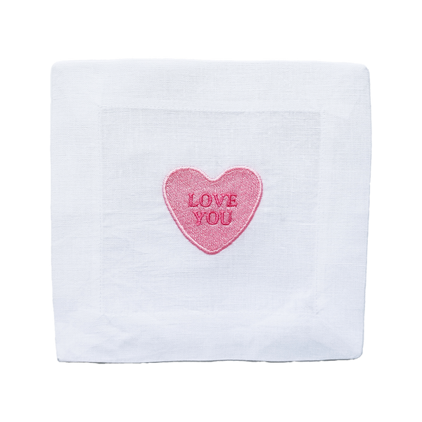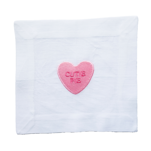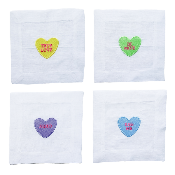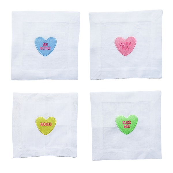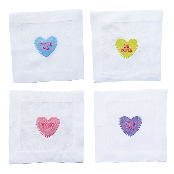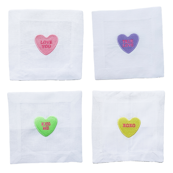 When words of affirmation escape you, Lettermade's Valentine Conversation Hearts know just what to say. The perfect match for your cocktail of choice. Each napkin in the set features a different color heart and message like Cutie Pie, Love You, XOXO, Be Mine, Kiss Me, or True Love.