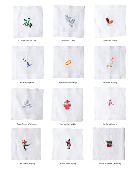 Add a touch of festive elegance to your holiday gatherings with our 12 Days of Christmas Napkin Set, each delicately embroidered with a gift from the beloved "12 Days of Christmas" tune. These napkins are the perfect blend of tradition and whimsy, making them an ideal addition to your holiday table setting or a thoughtful gift for loved ones.