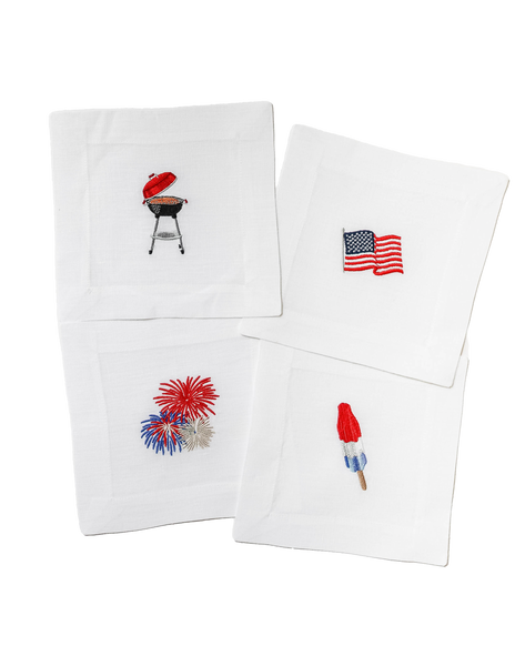 Add a touch of patriotism and individualism to your 4th of July cocktail. As in "no, the fireworks is MY margarita glass!" Each set contains one of each: Fireworks, BBQ Grill, Bomb Pop, and American Flag.